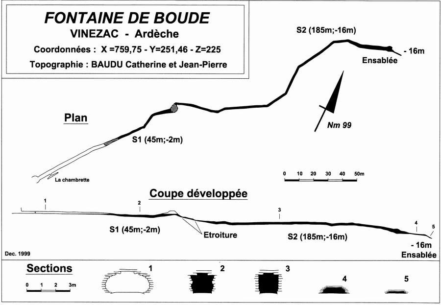 S1 : 45 m et S2 : 150m (30', -10 m). Le 3 juillet 1999, je termine l'exploration et réalise la topographie du S1 et du S2 (45', -16 m). Le terminus est un gros remplissage de sable qui semble infranchissable. J'ai essayé de forcer le passage en creusant, sans succès. Je m'arrête à 16 mètres de profondeur. |