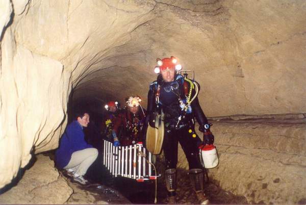 En un week-end, nous réalisons la topographie complète avec une vision des terminus et des cheminées noyées. Nous sommes 12 plongeurs et deux porteuses. Nous passons une échelle en aluminium de 6 mètres dans le S1 pour monter le puits de 5 mètres (moment de rigolade inoubliable) et deux photographes tentent de faire quelques clichés (eau très chargée). La cavité est réequipée et nettoyée complètement de ses anciens fils.