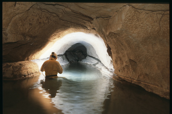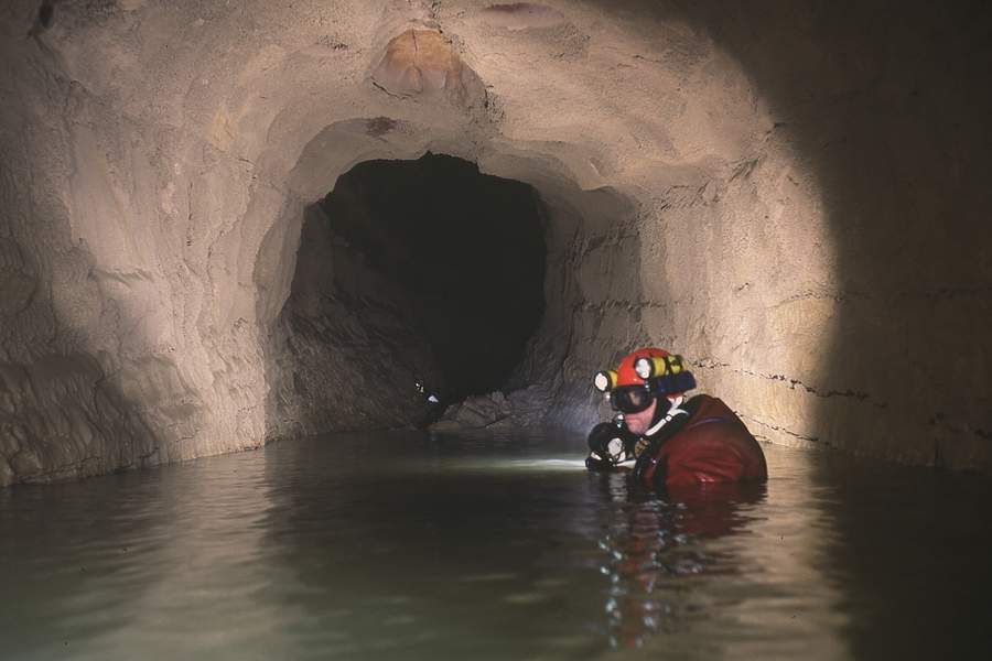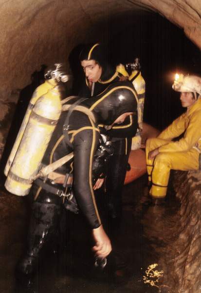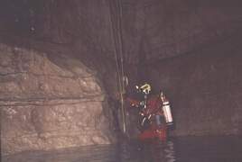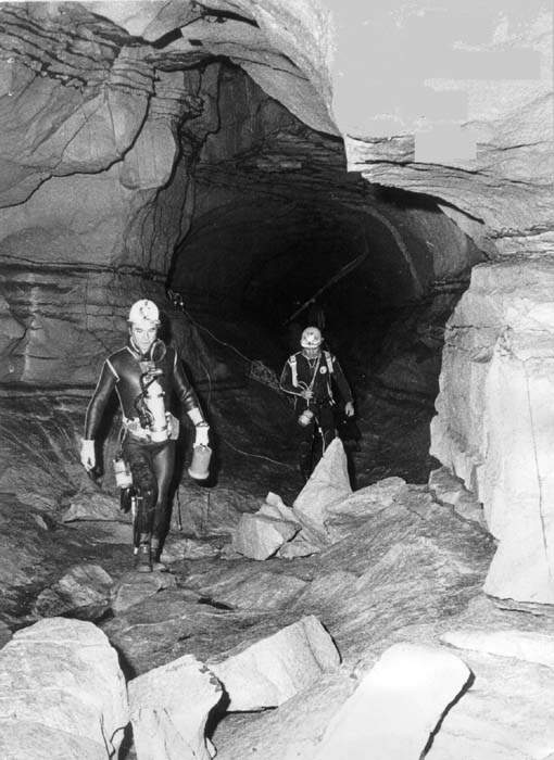 1973, la même équipe débouche après 150 m de galerie noyée au pied d'une escalade de 5m.