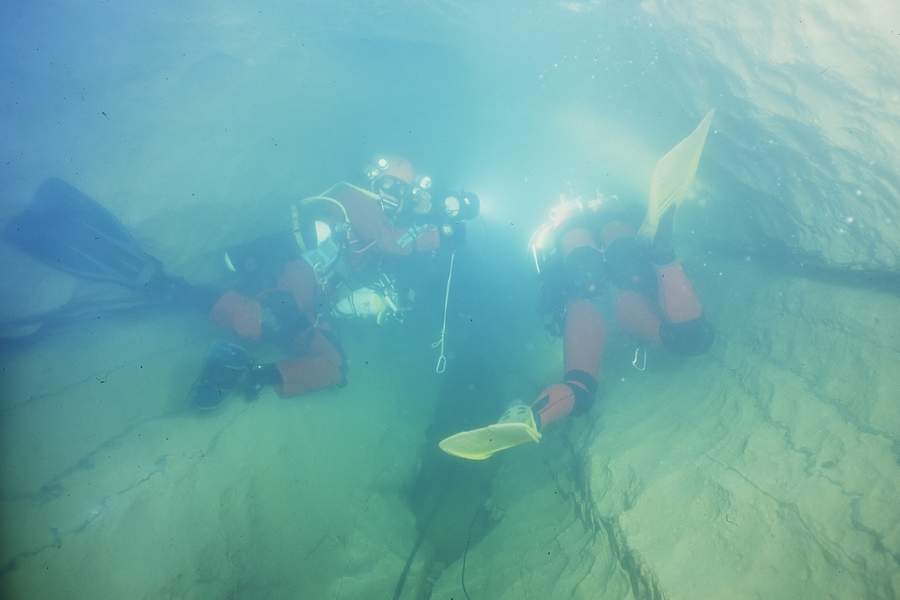 1978, F. Leguen plonge le S.2 sur 230 m, –25 et s'arrête sur vaste diaclase remontée jusqu'à –9 m.