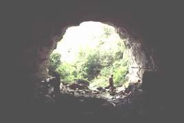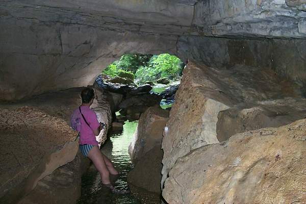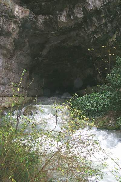 La cavité s'ouvre sous un immense porche. La présence de gros blocs de basalte est de bon augure. Plusieurs dizaines de mètres de galerie confortable conduisent à un superbe siphon. Ce verrou noyé est en forme de conduite forcée. Elle peut être admirée à l'air libre sur 20 mètres. La partie noyée fait 140 mètres. La galerie est en pente douce jusqu'à un incident géologique. Un ressaut nous entraîne au point bas à –9 mètres. Puis, c'est la remontée pour déboucher dans des volumes confortables, hauts de 5 à 10 mètres. Une première escalade de 5 mètres, équipée, permet d'atteindre une plate-forme avant une nouvelle escalade en opposition de 3 mètres. La suite est facile, la progression se fait dans un beau couloir, parfois aquatique. Deux gros éboulements ralentissent la progression. Il faut trouver un passage sur la base à droite entre les blocs.