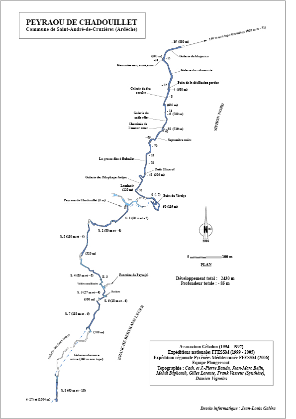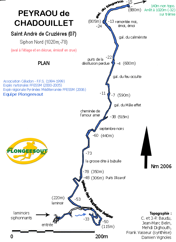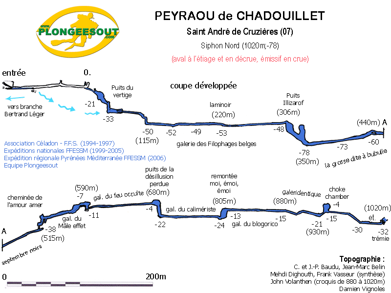2001 La topographie intégrale du siphon nord est levée et l’exploration poursuivie jusqu’à 505m de l’entrée (-42) après le point bas de –78. La topographie de la partie explorée est levée au retour.
