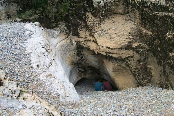 Dans le cours asséché de la Claysse, une dépression de galets roulés dévale jusqu'à un modeste orifice baigné d'une eau cristalline.
