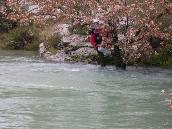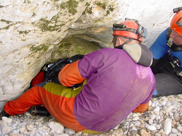 Dès les premiers mouvements dans la vasque, d'antipathiques volutes d'argile annihilent la visibilité. Si on ne prend pas soin à rester sur le côté rocheux du bassin, on glisse en aveugle jusqu'à -7, le long d'une pente de gravillons mêlés de limons jusqu'à -2.