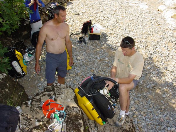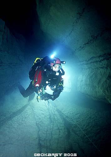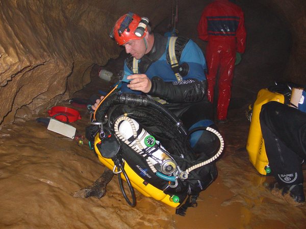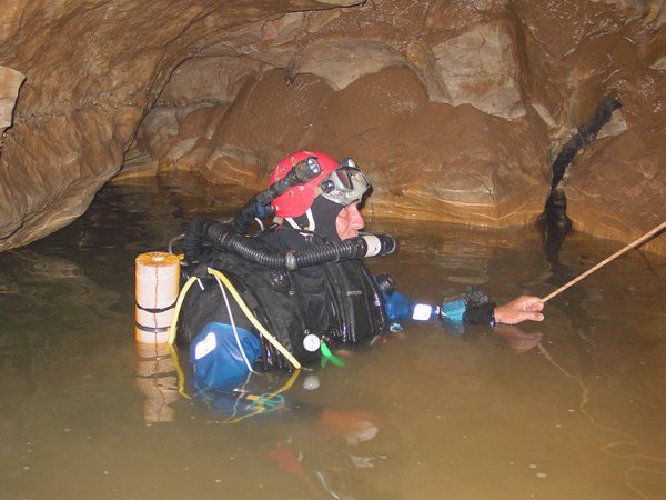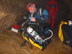 « We had a good dive, we were able to progress beyond your limit a short way, after 60m at a depth of about 24m we reached a large underwater chamber which went up to -3m, however the way on was on the floor, over a debris bank. 80m beyond this at a depth of just over 30m is a squeeze, then the passage reaches a choke which could not be passed. It is likely that it would be necessary to spend some considerably time removing boulders to pass. We laid a total of 140m of line beyond your end point, the choke being at -32m.