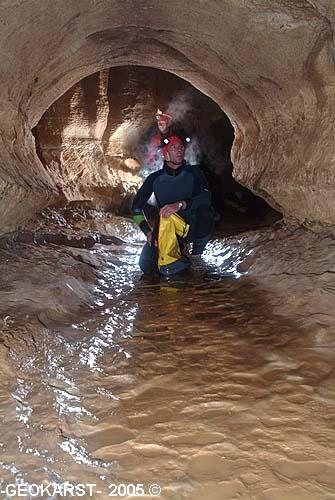 Vers le Sud, après un seuil immergé, on recoupe un beau conduit (3x4m) actif dont l'origine provient d'un siphon: le premier de la branche Bertrand Léger, globalement orientée Sud/sud-ouest.
