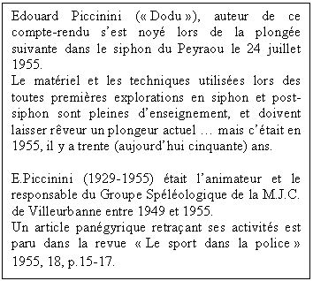 "Après un siphon de 5m et une cloche d'air, deux plongeurs s'engagent dans le second siphon, assurés par un troisième plongeur. Ils parcourent une trentaine de mètres, lorsque E.Piccinnini décide de ressortir pendant que son compagnon poursuit sa plongée. Au retour, ce dernier retrouve son coéquipier mort, à quelques mètres de la surface. Ses tuyaux sont rompus, son détendeur cabossé. Il reste de l'air dans ses bouteilles."