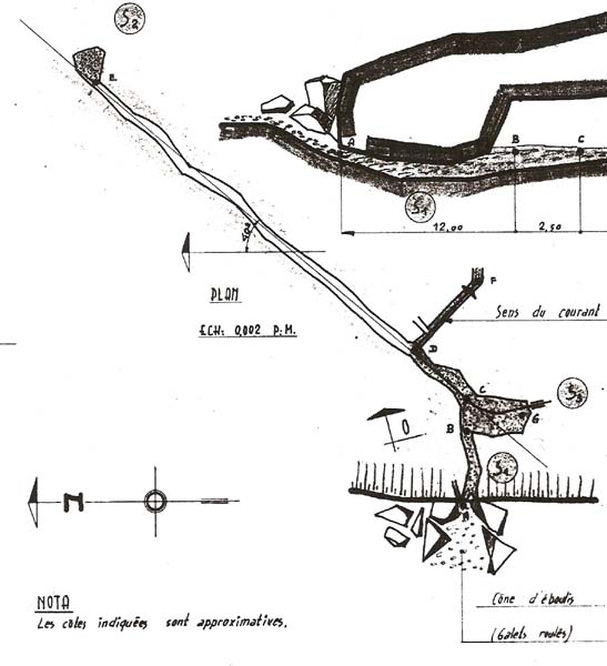 La fracture qui conduit à l'air libre est suivie d'une dizaine de mètres de progression rampée dans le lit du ruisseau, puis on avance debout dans de longs biefs dont la profondeur croît progressivement. Après 58m à ce régime, débute le S.4 (65m;-6) qui présente un profil en dents de scie et d'importants remplissages sableux.