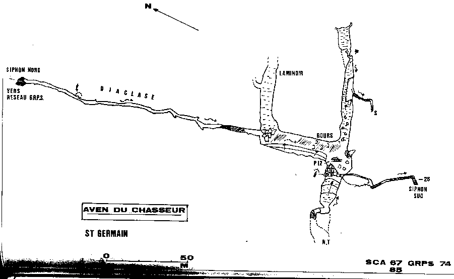 En 1974, le G.R.P.S. plonge le siphon ( 30 m/- 3 ; et découvre un réseau actif remontant très boueux, franchis un second siphon similaire et s'arrête sur une trémie d'où sort le ruisseati ( dvlpt total : 700 m ) .