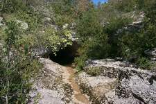 Un orifice de 40cm de diamètre donne sur un P10 (Arbre + échelle), à la base de celui-ci deux étroiture élargie donne sur un P8 (2S + AN corde de 20m). Total du développement de la traversée 450m dont 230m noyés.