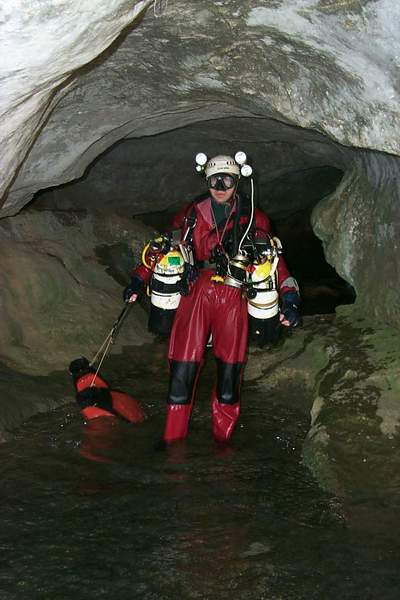 Le début de ce siphon est un peu glaiseux. C'est une galerie en conduite forcée, encombrée de blocs. Dans cette partie, j'ai trouvé une côte de 60 cm et une dent, qui ont été sortis pour analyse. J'ai laissé en place le reste pour les futures générations de chercheurs (respectons les lieux). Le siphon de 160 mètres franchis, l'actif est retrouvé.