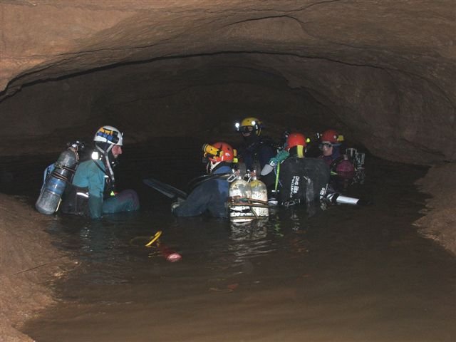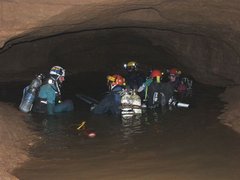 Enfin, le grand siphon, le S5, avec ses 230 mètres pour 39 mètres de profondeur, il se franchit sans difficulté. Avant le point bas, la descente s'effectue dans un grand éboulis de sable. C'est un très beau remplissage à voir la forme du plafond. Seule le point bas est moins confortable, avec un passage entre les blocs, mais il se franchit bien. La remonté est superbe et s'effectue dans un volume important. La sortie s'achève dans une salle basse, c'est un lac encombré de blocs.