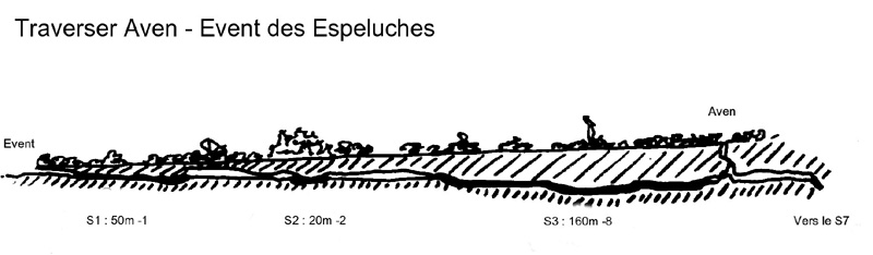 Mai 2005 ; Repéré par Jean Pierre Giangiordano, qui désobstrue l'entrée de la cavité avec Jean Claude Leroy. Ils découvrent un P.10, s'arrêtant sur étroiture d'où ils entendent de l'eau couler ! L'équipe renforcée par Bernard Négre et de Jean Marie Chauvet désobstrue deux étroitures et tombe sur un P.8m pour arriver dans une rivière souterraine qui bute de chaque côté sur des siphons équipé de fil d'Ariane…La jonction est faite avec les Espeluches. Petite histoire : Bien que ce post siphon fut découvert par JM Chauvet lors qu'il redécouvrir la rivière par l'aven, il ne reconnu pas l'exondé…