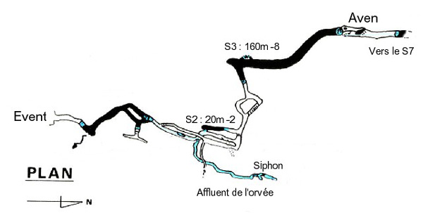 Après avoir passé un lac et laissé l'affluent de l'Orvée en hauteur à droite (diaclase étroite), nous trouvons le S2. C'est une très jolie vasque encombrée de petits cailloux et de restes d'os cassés et érodés. Le franchissement est très court, 20 mètres. Ce siphon peut être shunté par un réseau supérieur (infranchissable avec des bouteilles). Il est possible de passer par deux galeries différentes pour rejoindre le S3.