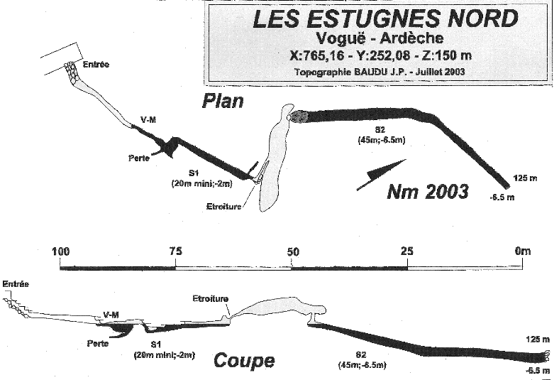 Dans le cadre d'exploration systématique des réseaux du Coiron, nous décidons de réaliser la topographie de cette cavité. Une confusion est née dans l'esprit des gens et souvent les Estugnes Nord et sud sont confondus. Certains chiffres sont avancés, 130 mètres de développement voir plus de 300 mètres. En fait, le développement était de 55 mètres.