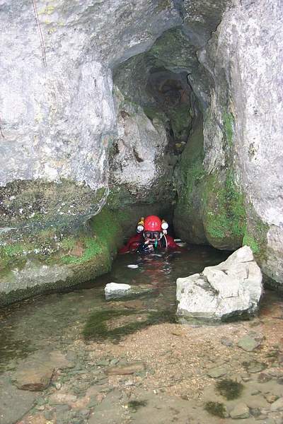 La source s'ouvre sous un petit porche, situé sur une faille. Quelques mètres plus loin une grosse marmite est alimentée par la même eau (observation de Catherine Baudu, de sortie de bulles lors de mes immersions). Le portage est court et confortable. L'entrée est une petite retenue d'eau naturelle, peu profonde (10-20 cm). La suite est au fond de la faille. La descente dans un puits de trois mètres est technique (avis personnel). Pour passer, deux solutions, le décapelé ou le déstructuré (la dernière solution m'a le plus tenté).