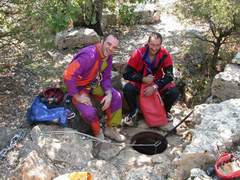 Le 14/01/1989, Thierry MARCHAND (S.C.Aubenas-07) et Philippe MOYA, partis pour l'exploration post-siphon, doivent consacrer plus de 30 minutes à désobstruer le fond de la vasque et reéquiper le siphon. Derrière, un talus argileux remontant leur oppose de sérieuses difficultés.