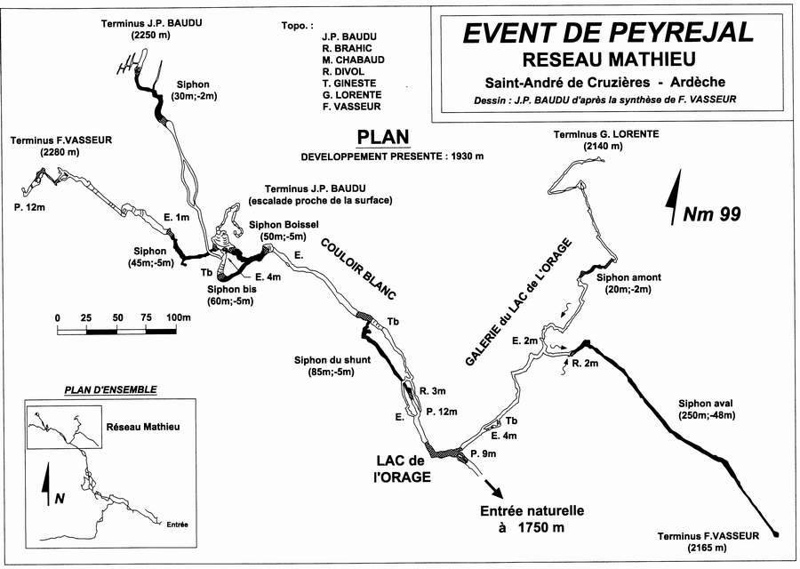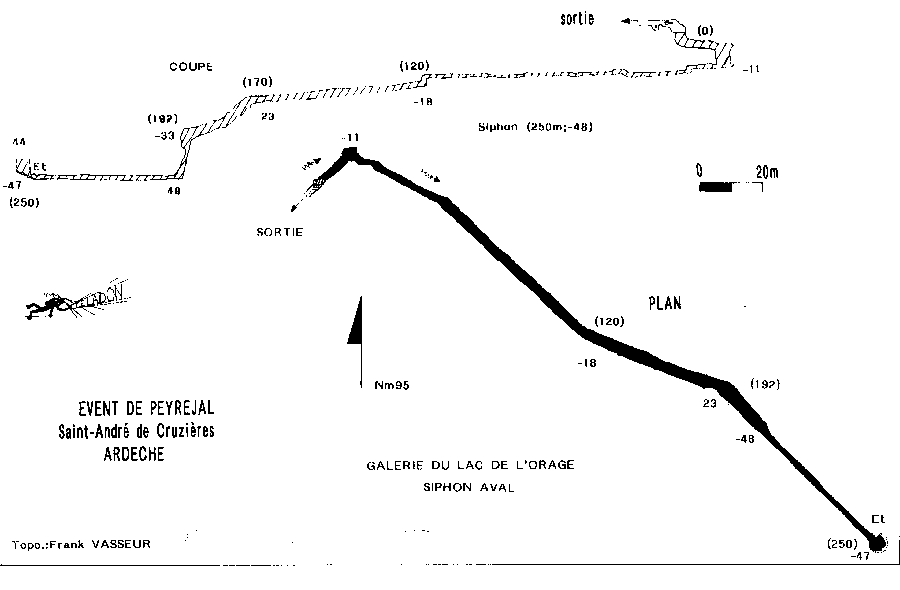 Le 25/06/1995: Frank VASSEUR franchit à nouveau le siphon terminal. Ce dernier est court (50m;-5) et sort par un rétrécissement dans une salle argileuse. A l'aplomb de la vasque en rive droite, une prometteuse lucarne (1,5x2m) demeure inaccessible, défendue par une escalade de 4m surplombante et argileuse.