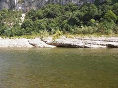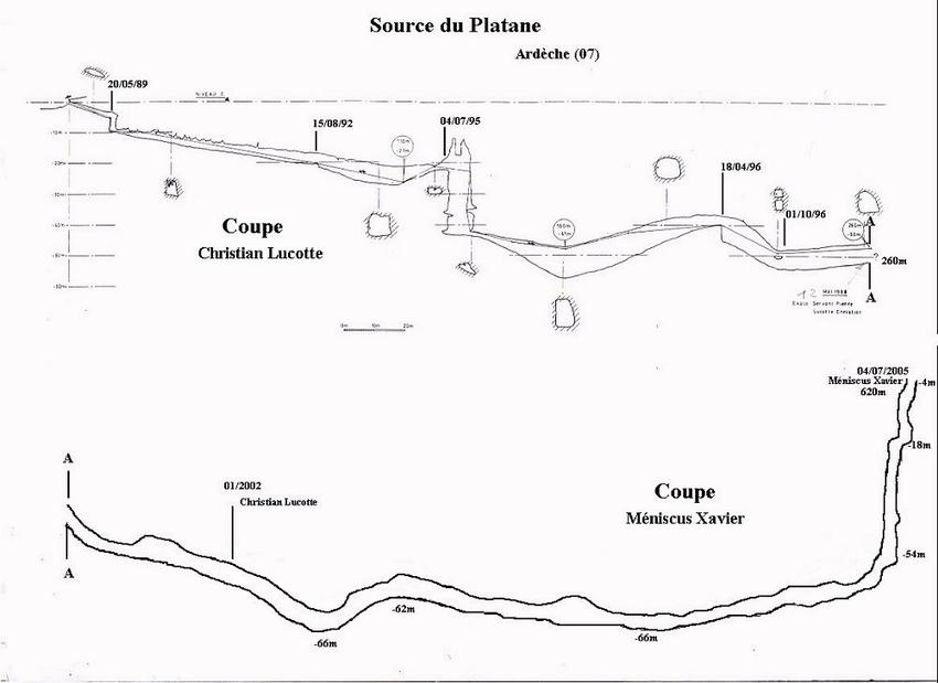 Situation La source du Platane est une source sous-fluviale située 2 km en aval du bivouac du château de Gaud, sur la rive gauche de l'Ardèche. Elle est matérialisée pas un platane qui pousse sur une dalle calcaire, juste au dessus de l'exutoire de cette résurgence. Historique Cette source fut découverte et plongée pour la première fois par le commandant des sapeurs pompier plongeur de l'Ardèche, Christian Lucotte, le 20 mai 1989, sur une vingtaines de mètres, jusqu'au niveau du premier puits. 15 octobre 1995, Daniel Dumas assisté de Frédéric Martin, progresse de 10 m supplémentaires malgré l'Ardèche en crue. Le 28 octobre 1995 : Daniel Dumas et Frédéric Martin explorent 100 m supplémentaires avec un point bas à -48m. La turbidité de l'eau les contraint à reporter la topographie. Le 29 octobre 1995 : Frédéric Martin progresse encore de 15m malgré un débit constant sur une bouteille du tri dorsal. Plusieurs équipes se succèderont pour porter le terminus à 420m, à la profondeur de –60m, en janvier 2002. Nous (les ouaib masteurs) serions heureux de développer ici un historique détaillé. Merci aux auteurs de ces explos de nous communiquer les dates et résultats de leurs plongées. Le 4 juillet 2005, l'équipe R.A.B.A. progresse jusqu'à 620m de l'entrée, arrêt à -8 après un point bas à -66.