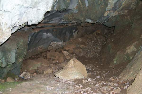 diaclase fossile. Au dessus, une galerie boueuse et ébouleuse se termine