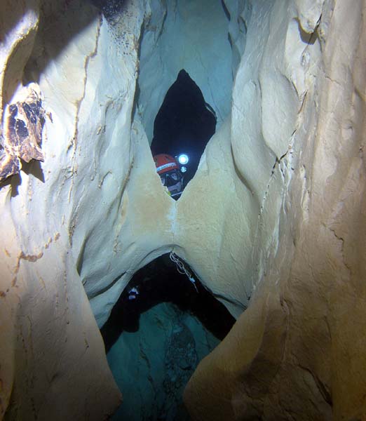descend rapidement avec le passage d’une étroiture à –5 mètres. Après