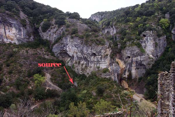 source se situe à 140 m sur la gauche juste au pied du cirque (direction