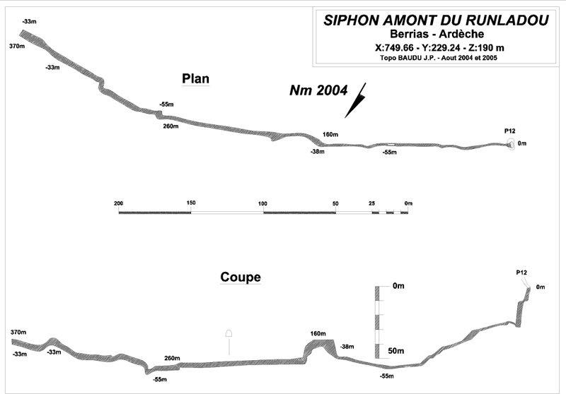 1983, F. Poggia et J.M Chauvet explorent le siphon amont sur 160 m et s'arrêtent à -40 m (point bas –60m) Le 24 juillet 2004, Jean-Pierre Baudu ajoute 100 m dans le siphon amont et s'arrête à –55 mètres.