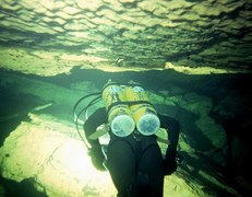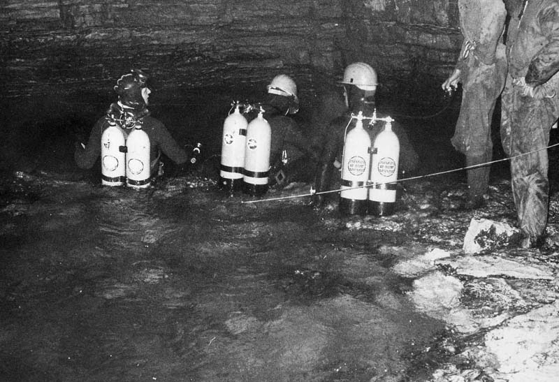 b) 30 m avant le terminus : une vaste cheminée immergée recoupe une galerie (3 X 3 m) argileuse à souhait. Après un parcours de 30 m, le couloir se poursuit à l'air libre sur une cinquantaine de mètres. Arrêt sur laminoir colmaté. c) au niveau de la "cloche" : un petit réseau supérieur exondé double le collecteur noyé sur 130 m en plusieurs branches. La principale se termine sur un court siphon de 5 m suivi vingt mètres plus loin d'une trémie impénétrable.