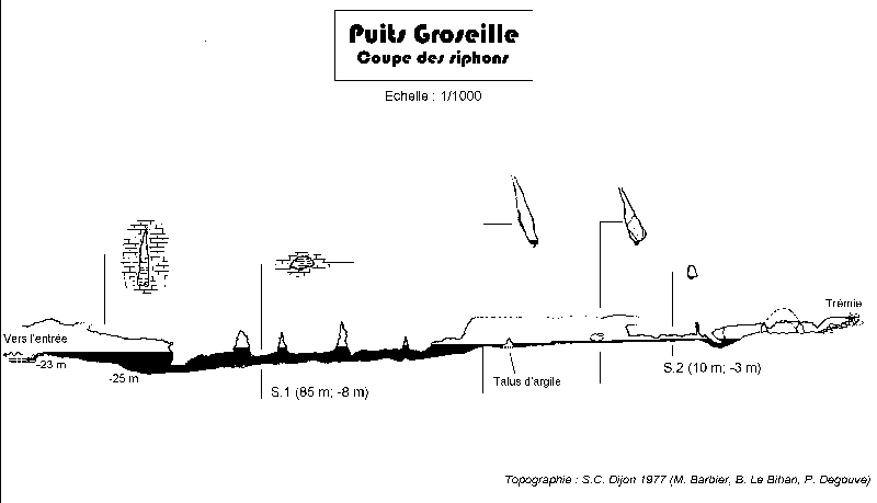 Description Emergence temporaire. Galerie basse, entrecoupée de ressauts, débouchant à -20 mètres dans une petite rivière souterraine, avec siphons amont et aval. 1) Siphon amont Les premières datent de 1964 et 1965, époque à laquelle la zone d'entrée est plongée sur quelques dizaines de mètres (-8 m). En 1968, l'A.J.S.C. franchit le premier siphon (85 m, -8 m) et s'arrête sur un S2, après 65 mètres de galerie en diaclase inclinée. L'année suivante, le S.C. Dijon topographie une partie du SI. Au début des années 1970, l'A.J.S.C. atteint une trémie impénétrable, 40 mètres après le S2 (10 m, -3 m). En 1976, le S.C. Dijon lève la topographie post-siphon. Depuis cette date, une multitude de plongeurs ont dépensé leur énergie dans cet éboulis, sans malheureusement de résultats notables. 2) Siphon aval Impénétrable dès l'entrée, (S.C. Dijon 1980) Bibliographie DEGOUVE (P) - LAUREAU (P) - 1976 - Le puits Groseille - "Sous le Plancher" - Bulletin du S. C. Dijon n°1et2p15à22 BILLARD (P) - 1975 - Le puits Groseille - "Sous le Plancher" - Bulletin du S. C. Pommard n ° 3 p 15