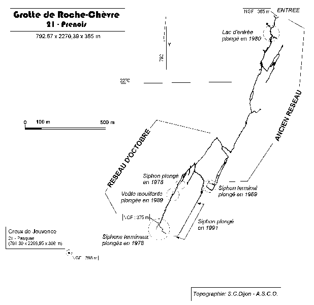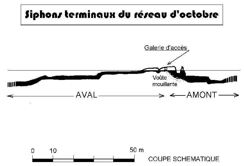 Historique 1969 - S.C. Dijon : B. HUMBEL Description Rivière souterraine composée essentiellement de méandres étroits et de passages bas. En 1969, le S.C. Dijon franchit le siphon amont de l'ancien réseau à 1 350 m de l'entrée (12 m, -1 m) et jonctionne avec le plan d'eau terminal de la galerie fossile. En 1978, le S.C. Dijon plonge les deux siphons terminaux du réseaux d'octobre à 1 830 m de l'entrée : siphon amont : longueur 30 mètres. Arrêt à -5 m environ dans une diaclase étroite et glaiseuse siphon aval : exploré sur 70 mètres dans un petit conduit, sans aboutir. La même année, un autre siphon intérieur (1 570 m de l'entrée) est franchi (8 m, -1 m) : arrêt sur S2 après 10 mètres exondés. Deux ans plus tard, le S.C. Dijon plonge le lac d'entrée. Aucun départ pénétrable n'est découvert. En 1991, dans une branche du réseau d'octobre, à 1 680 m de l'entrée, l'ASCO franchit une série de petits siphons espacés de passages émergés sur 300 mètres. Bibliographie DEGOUVE (P) - LAUREAU (P) - 1981 - L'écho des profondeurs - "Spélunca" - Bulletin de la FFS n ° 3 p 7 et 8.