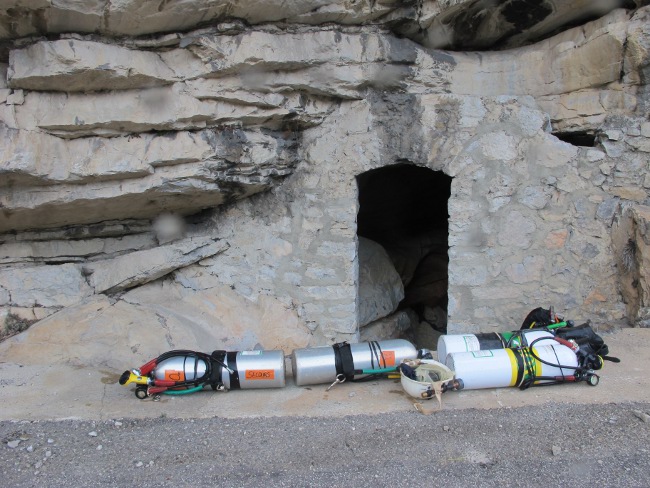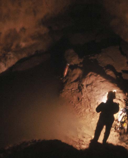1976 - Reprise de l'exploration par le PSP (Plongeurs Spéléos de Paris). Joël ENNDEWELL franchit le S1. ( Alain MORENAS, Pierre MOREL, Michel RAYMOND)