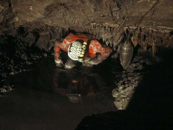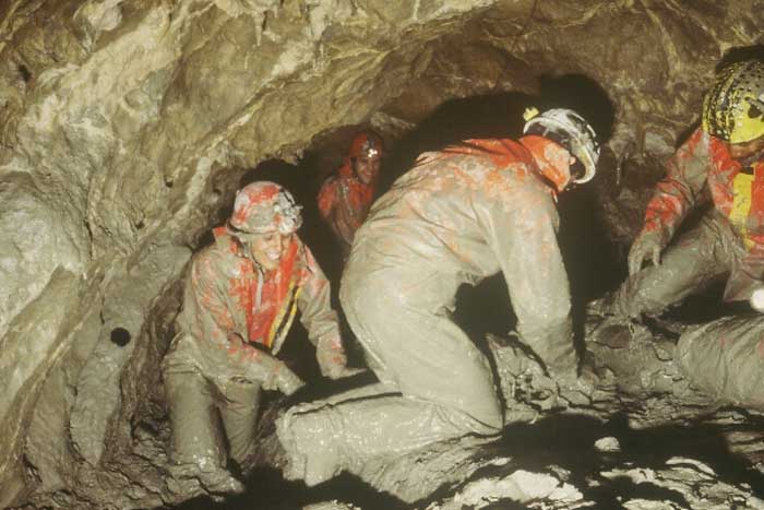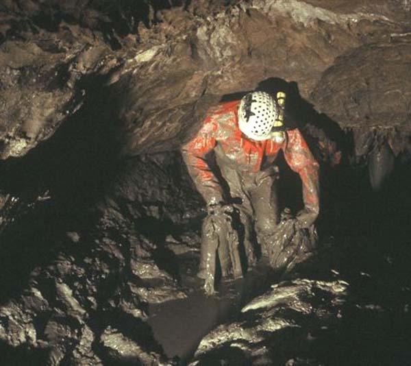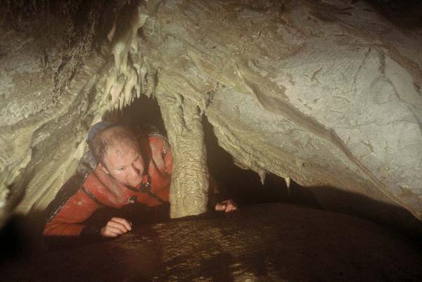 Bernard Glon explore sur 500 m le siphon Flahaut (membre du PSP, décédé de maladie en 1990).