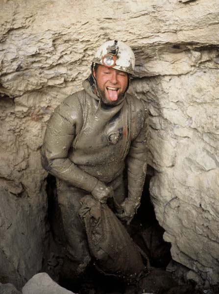 1977 - Exploration post S1, Xavier GOYER plonge le siphon qui porte son nom et le S2.