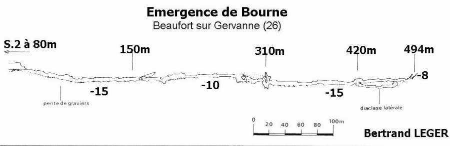 Le siphon (le S.7 en période d’étiage) plonge presque verticalement à –32 et se stabilise à cette côte. La morphologie change alors. Aux laminoirs bas et sableux de la zone profonde entre 1500 et 1900m, suit une galerie calquée sur une fracture haute de 7 à 8m et large de 3m. Elle se prolonge sur 140m à –32 puis remonte à –20 dans un puits remontant aux vastes dimensions. Le conduit remonte ensuite progressivement, avec de l’argile. Arrêt dans une cloche d’air à 2340m de l’entrée de la cavité. Arrêt sur siphon suivant.