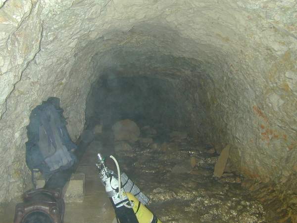 Une galerie de 150m parcourue par le ruisseau conduit au permier siphon que l'on peut shunter par une galerie basse, en rive droite. Une galerie active d'une trentaine de mètres rejoint le second siphon (600m; -137).