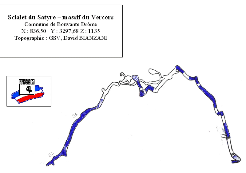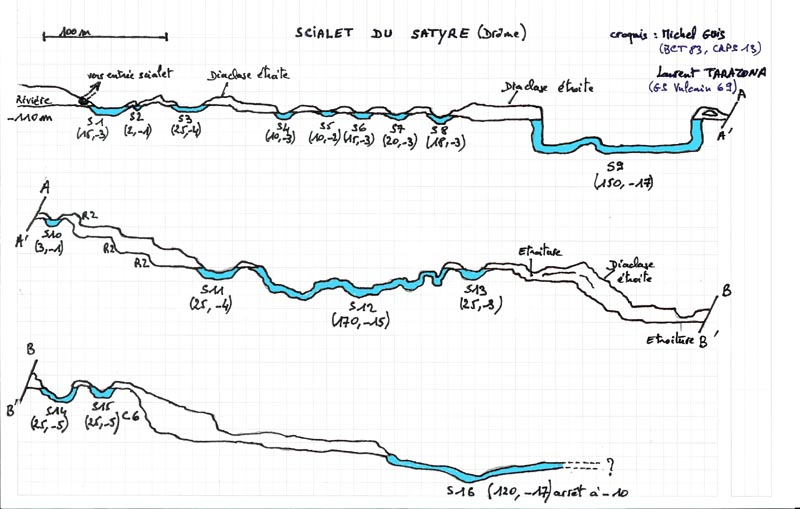 Le scialet du Satyre est un gouffre sympathique constitué d'une succession de petits puits séparés par quelques rétrécissements ponctuels. A –100m, un boyau vertical étroit de 5m débouche sur le dernier ressaut de 5m au pied duquel une étroiture horizontale débouche sur une jolie petite rivière.