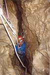 Cédric Clary franchit l'obstacle, S12: 170m/-15, S13: 25m/-4. Après avoir désobstrué une coulée de calcite, il s'arrête sur le S14.