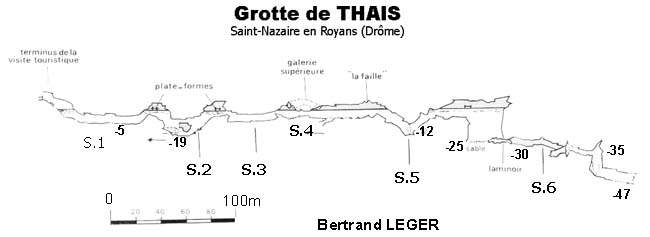 300m de galeries aménagées pour le tourisme conduisent au plan d'eau calme du S.1 (40m;-6). Une succession de siphons S.2 (40m;-9); S.3 (50m;-7); S.4 (5m); S.5 (45m;-11) entrecoupés de lacs et d'un seuil rocheux mène au S.6