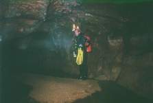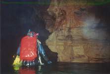 | Pour arriver à ce point, il nous faudra franchir 5 siphons et parcourir quelques centaines de mètres de galeries exondées présentant parfois une large rivière calme, parfois des méandres plus ou moins larges ponctués par de brefs passages en escalade. |