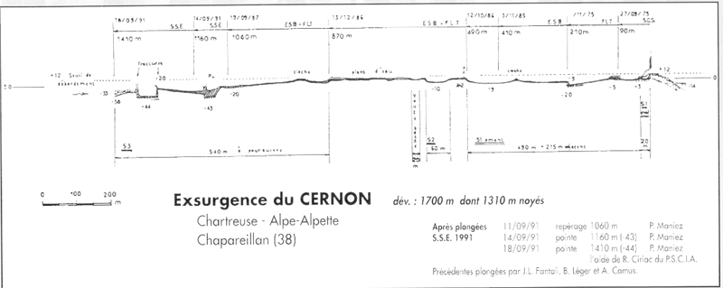 Le siphon plonge régulièrement jusquà 20 durant les 200 premiers mètres, puis plonge à 43. Après 60m à cette profondeur, le conduit remonte à 20 jusquà une fracture qui ramène à 44. 60m plus loin, on recoupe une nouvelle fracture qui remonte à 33. Arrêt sur autonomie sans discerner les plafonds.