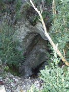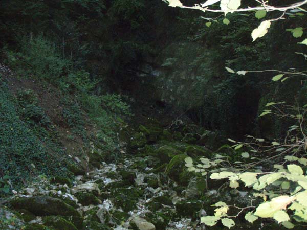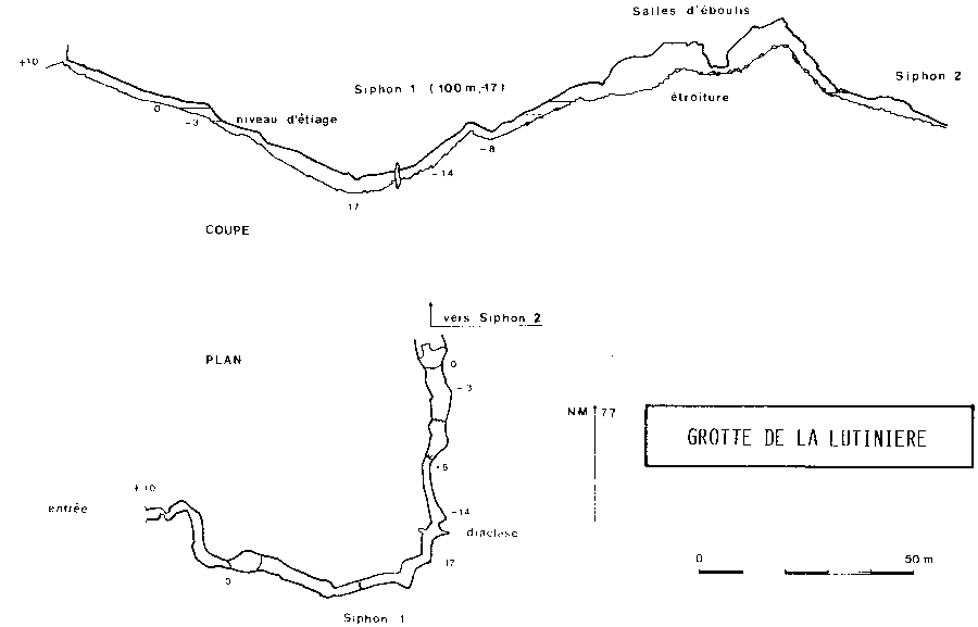 Localisation Au village de Fontanil, remonter le Talweg à sec au dessus de la résurgence du Fontanil située sous le pont à coté de l'école. A une bifurcation, prendre le lit de droite. Accès 5mn. La Grotte de la lutinière est un trop plein de la résurgence du Fontanil qui sort 126 m en aval et dont le débit d'étiage voisine les 10 l/s. HistoriqueLes explorations ont débutées depuis longtemps des inscriptions dans la galerie d'accès au S1 en attestent. Maurice Chavrier et Robert Juge du SGCAF furent les premiers à franchir le S1 le 18/9/1959. Puis c'est Bertrand Léger qui explora le S2 à trois reprises pour trouver la suite en vient (1973, 1977, 1982.) DescriptionLe développement est de 260 mètres dont 165 mètres de siphon, dénivellation 37 m. La grotte débute par une galerie descendante de 20 m qui donne sur un premier siphon long de 90 m et 17 m de profondeur. La galerie de 60 m qui lui fait suite est coupée de deux salles ébouleuses (galerie Jeanne Folcher) et conduit à un deuxième siphon plongé sur 75 m (point bas -25m) arrêt sur une trémie de gros blocs à -19m. La visibilité dans les siphons et de l'ordre d'un à deux mètres à l'allé et nulle au retour en raison de la présence d'argile dans la galerie. Conseils : Attention lors d'averse importante ou de crue, le risque de mise en charge violente et systématique dans la cavité. Description des siphons S1 : 90 m -17m S2 : 75m -25m. |
