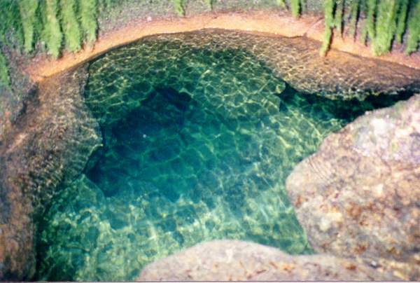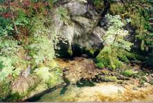 fond de la gorge. L'exsurgence est sur la rive opposée.