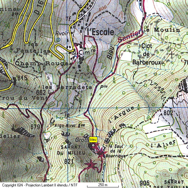Un joint de strate incliné à 30° (nord/nord-ouest) descend jusqu'au siphon (120m;-9) (direction sud/sud-ouest) suivi de 200m de galerie éxondée. La désobstruction d'un laminoir très cupulé permet de rejoindre le trou du vent du Blau (alt.700m). Jonction également possible par une autre galerie exondée.