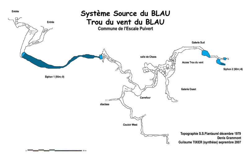 14/11/1988: Philippe JASION et Denis PARISIS (G.S.P.C.C.D.F.-75) aidés par la S.S.Plantaurel et la S.S.Aude-pays d'Olmes franchissent le siphon durant un étiage, et jonctionnent le trou du vant du Blau.