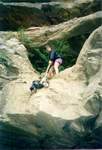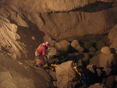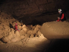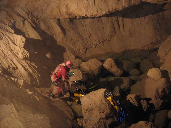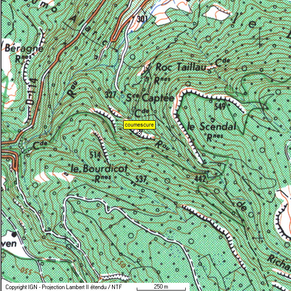 Localisation Au sud de Labastide en val, sur la D.114 au point côté 301, prendre à gauche le chemin conduisant à la source captée. Remonter ensuite la combe du ruisseau de Richard jusqu'à la gueule de la cavité, que l'on atteint par une escalade côté gauche. Historique Robert De JOLY bute sur le siphon le 08/08/1938. Description Porche en falaise suivi d'une galerie rectiligne (4x2m) descendant sur 50m pour s'achever sur le siphon (120m;-6) à -6. Le conduit noyé (6x3m) bute sur une trémie. Un départ en rive gauche a été exploré en décapelé (S.C.Paris 1978), arrêt sur visibilité nulle. |