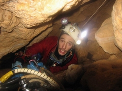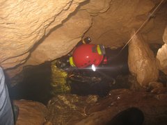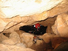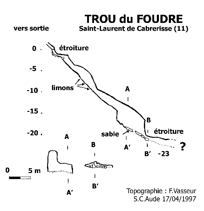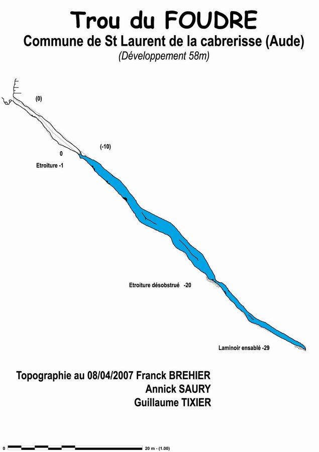 Reconnu par un plongeur belge (la Cordée) en octobre 1990. Arrêt à -20m sur étroiture. Mars et avril 2007, Franck Brehier, Annick Saury et Guillaume Tixier. Après 2 plongées de désob les 18 et 31 mars, le 8 avril l'exploration est poursuivie de 15m supplémentaires arrêt à -29m sur laminoir comblé de sable. Une galerie étroite et fortement déclive bute à -8m sur un plan d'eau (1 x 05). Le siphon débute par une étroiture puis s'élargit à partir de -10m. A -20m la voûte se rapproche du sol, constitué de gros blocs enchâssés dans le sable. Arrêt à -29m sur laminoir comblé de sable. |