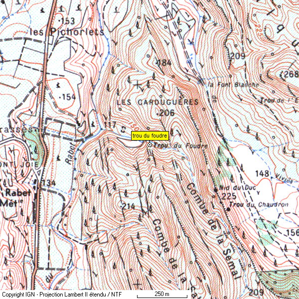 Situation Deux kilomètres avant St Laurent de la cabrerisse en venant de Narbonne par la N613 prendre la D106 direction Coustouge sur 2 km puis 100m avant d'arriver à la métairie du Rabet prendre un chemin de Vigne sur la gauche, garer le véhicule au bout du chemin, puis traversé le rau et suivre la sente vers l'Est jusqu'à là source impénétrable. Le trou lui se trouve au-dessus en bordure droite du talweg.