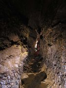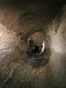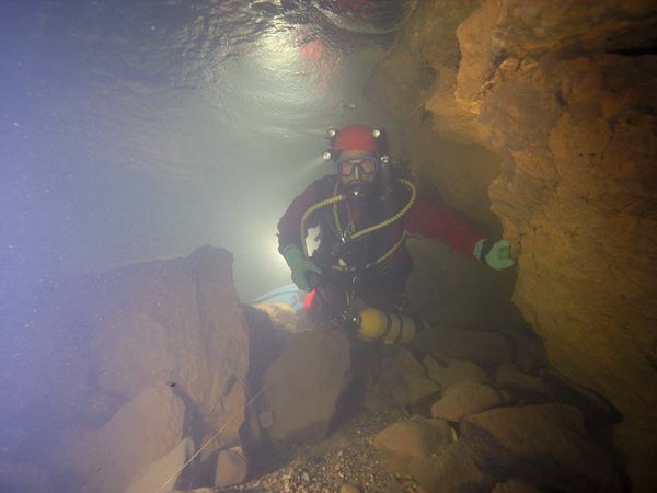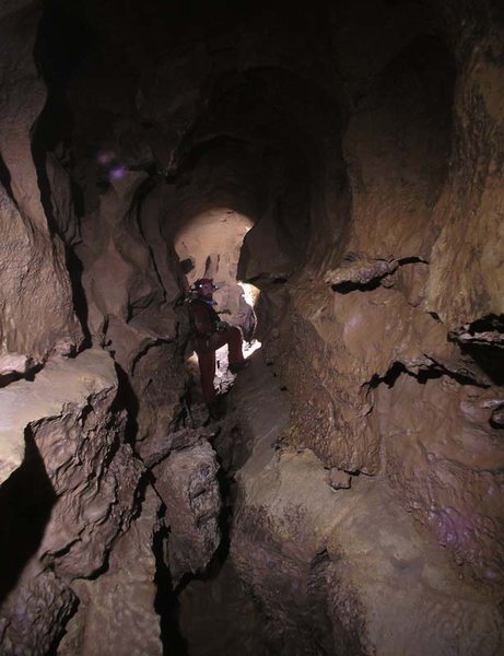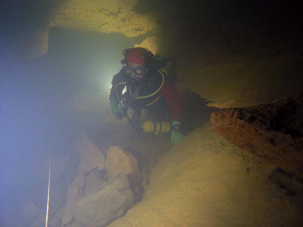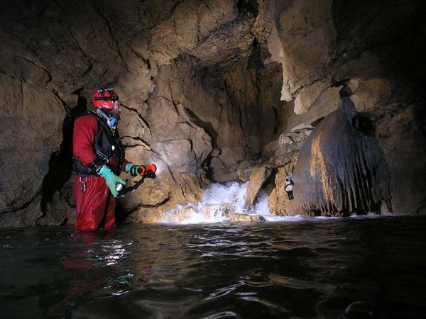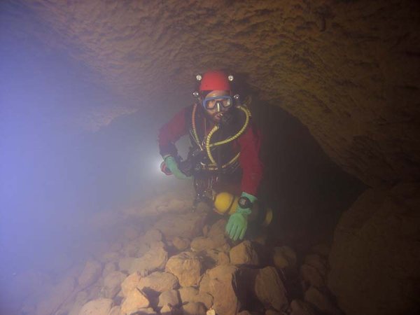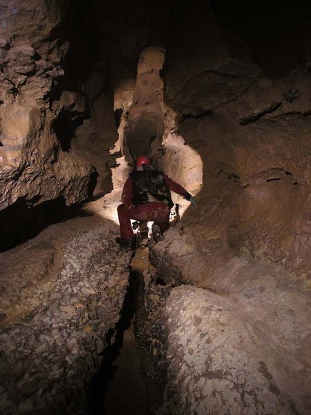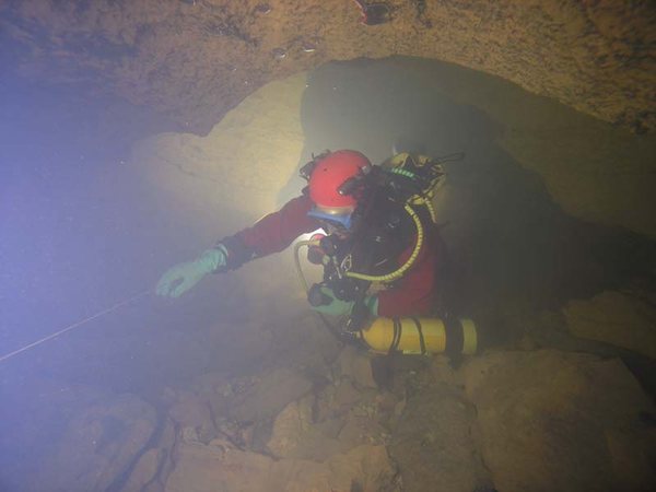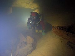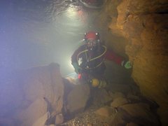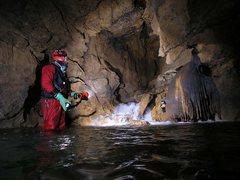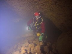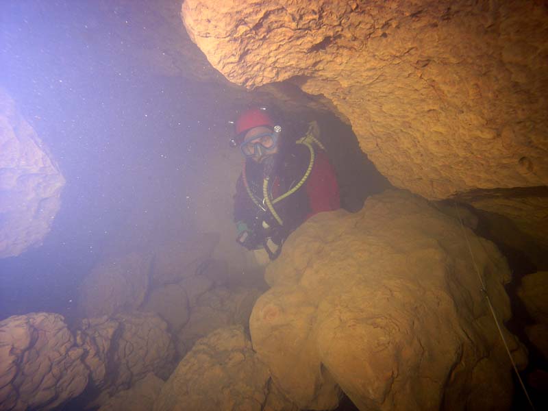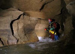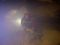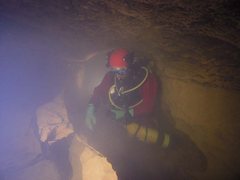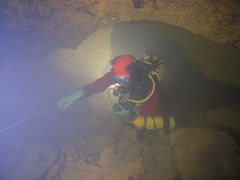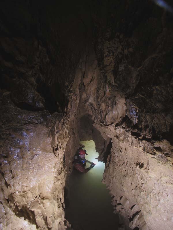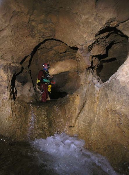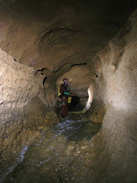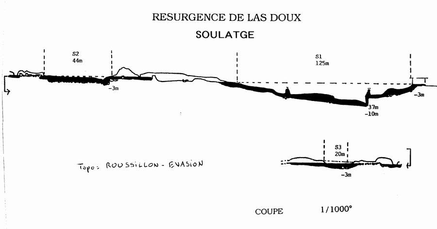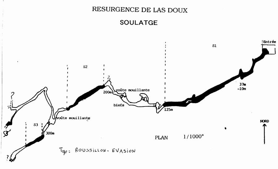 Description Derrière le S3bis (Le S3 bis mesure 35m pour un point bas à -3), 10m de conduite forcé de 1,5m de diamètre remonte jusqu’à un S4bis qui est très court (5m ;-2) suivi de quelques mètres remontants jusqu’à un cinquième siphon (32m ;-3,5). Derrière, 10m de méandre conduisent à un 6ieme siphon qui plonge directement à -2 et remonte progressivement pour émerger 15m plus loin. Là, une galerie basse de forme bien circulaire amène au S7. Arrêt à l'étiquette 45 mètres dans un beau puit remontant après un point bas à -10 (ça continu).