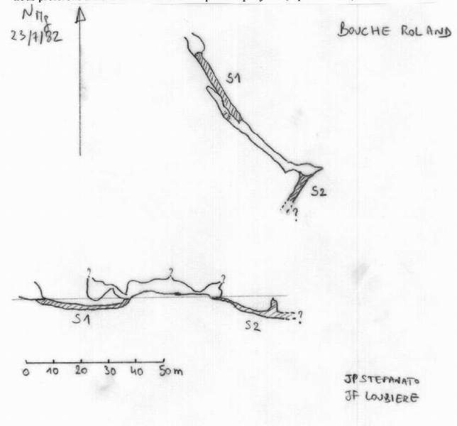 Les siphons 1 et 2 sont des laisses d'eau sans circulation à l'étiage, la grotte fonctionne probablement comme un trop-plein avec des mises en charge de 3 mètres, comme l'attestera les traces de crue. Le S1 (fait 30 m à-3 et débouche dans une diaclase. Une pente glaiseuse permet de revenir au dessus du siphon, sans autre continuation.