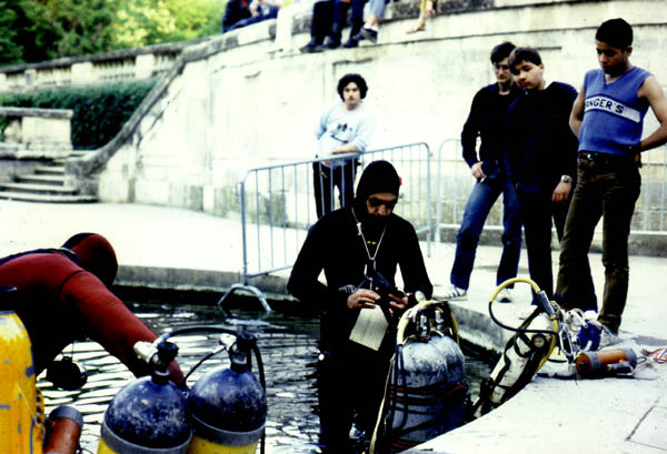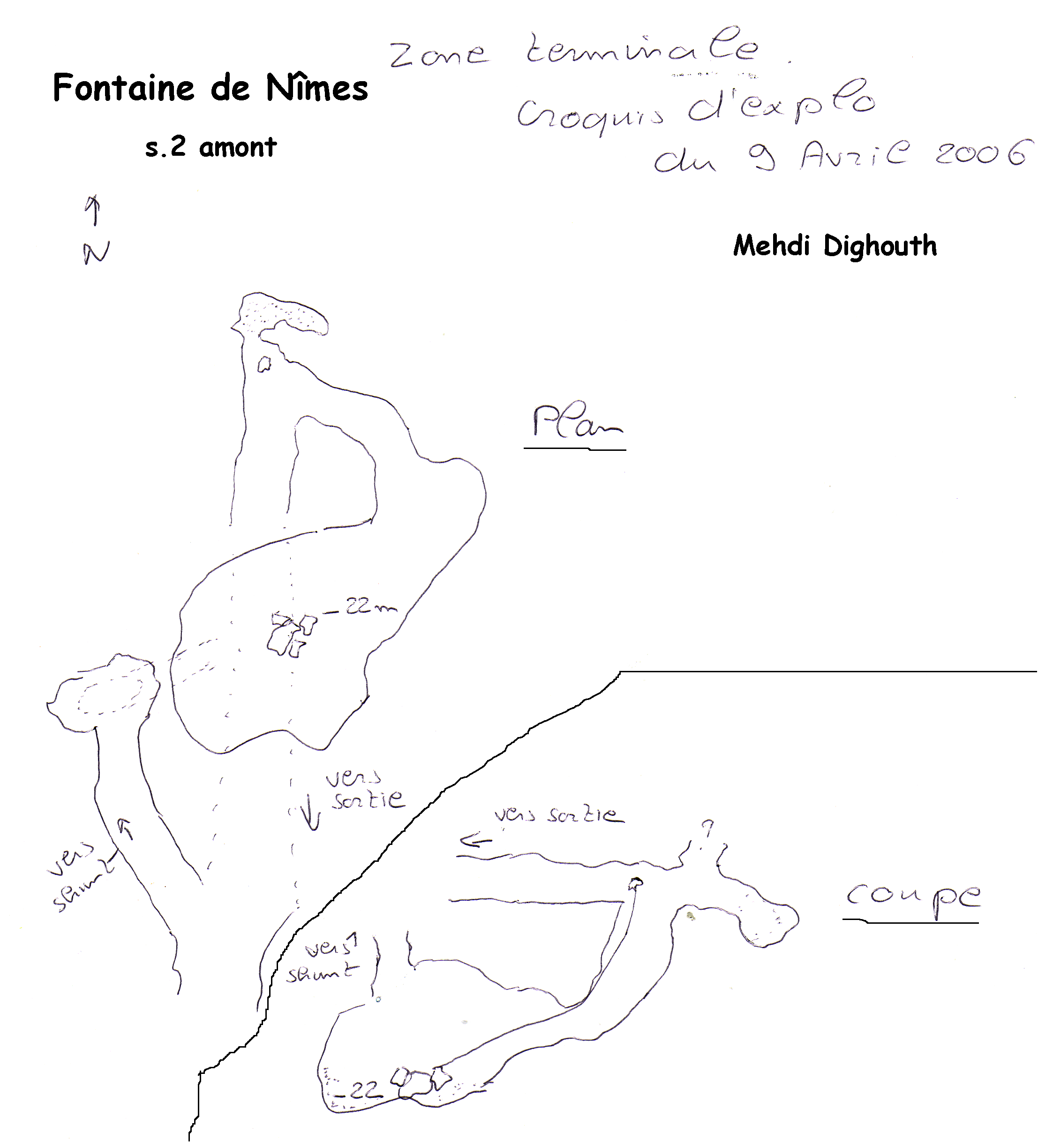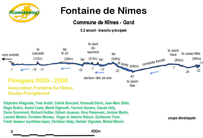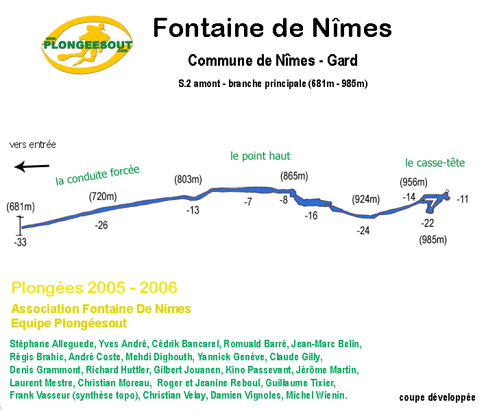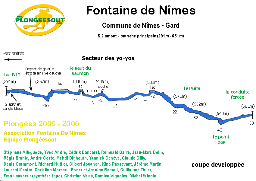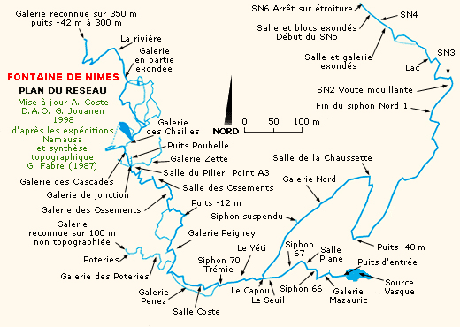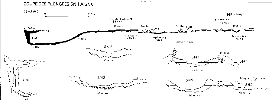 DE NEMAUSA VI A NEMAUSA XI - Ces six expéditions, effectuées exclusivement en plongée, vont faire évoluer considérablement la connaissance du réseau. La branche nord est explorée et topographiée sur plusieurs centaines de mètres, dans des conditions particulièrement difficiles (puits de 40 m, étroitures, boue, etc...). En 1984, au cours de l'expédition Nemausa X, le plongeur P. Penez franchi, pour la première fois et en solo, le siphon 1970 et son empilement de blocs (la Trémie). Au-delà, il explore quelques centaines de mètres de réseau.